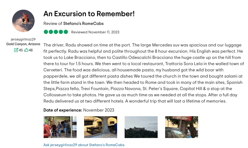 Jerseygirlinaz29 wrote on November 11, 2023: The driver, Radu showed on time at the port. The large Mercedes suv was spacious and our luggage fit perfectly. Radu was helpful and polite throughout the 8 hour excursion. His English was perfect. He took us to Lake Bracciano, then to Castillo Odescalchi Bracciano the huge castle up on the hill from there to tour for 1.5 hours. We then went to a local restaurant, Trattoria Sora Lela in the walled town of Cerveteri. The food was delicious, all housemade pasta, my husband got the wild boar with papperdele, we all got different pasta dishes We toured the church in the town and bought salami at the little farm stand in the town. We then headed to Rome and took in many of the main sites, Spanish Steps,Piazza fella, Trevi Fountain, Piazza Navona, St. Peter’s Square, Capital Hill & a stop at the Collosseum to take photos. He gave us as much time as we needed at all the stops. After a full day Redu delivered us at two different hotels. A wonderful trip that will last a lifetime of memories.