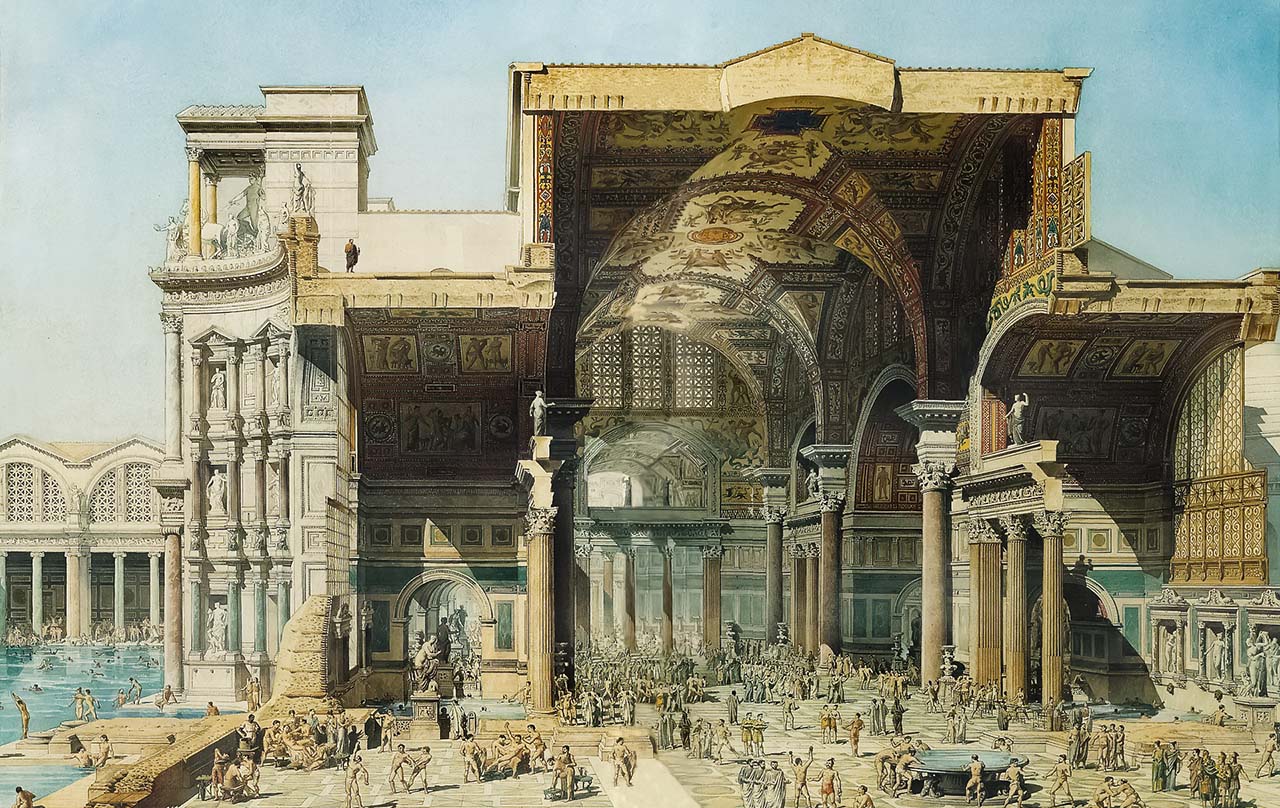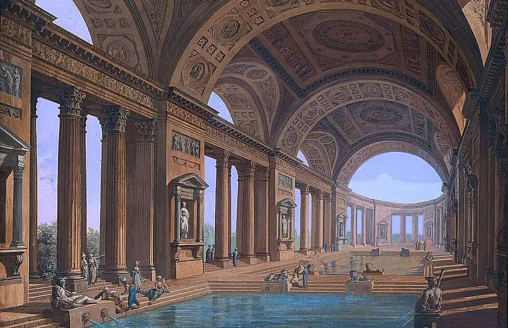 Ancient Roman tradition of public bathing in Rome was complex. For example, the Baths of Caracalla, one of the most famous bath complexes in Rome, were designed as multifunctional centers that offered a range of facilities beyond the basic bathing areas.